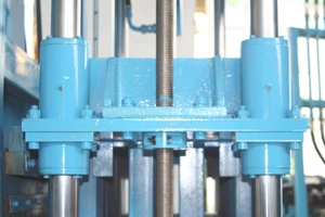 ມີກະບອກຕົ້ນໄມ້ຢູ່ເທິງແມ່ພິມ. ກາງຫນຶ່ງຮັບປະກັນຄວາມໄວຂອງການຍົກແລະອີກສອງດ້ານທັງສອງດ້ານຮັບປະກັນຄວາມກົດດັນຂອງ mold ເທິງ.